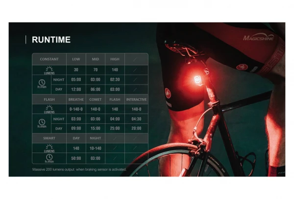 Le modèle le plus puissant de la série feux arrière de chez MagisShine, la Seemee 200 possède un feu principal extrêmement lumineux et un feu secondaire d’appoint. Elle offre une excellente visibilité avec sa fibre optique transparente, elle fournit un flux lumineux maximal de 200 lumens. Cette lumière offre une visibilité lumineuse à 360 °, elle vous offre une protection complète. La Seemee 200 permet aux coureurs d’être vus jusqu’à 3000 m