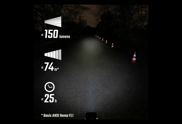 - 5 modes d’éclairage : High (150 lm) ; Mid (75 lm) ; Low (35 lm) ; Night flashing (100/40 lm) ; Day flashing (40 lm)