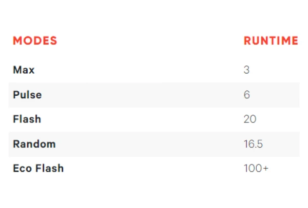 - 5 modes d’éclairages (Max, Pulse, Flash, Random, Eco Flash)
