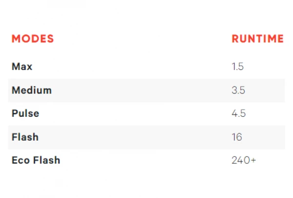 - 5 modes d’éclairages (Max, Medium, Pulse, Flash, Eco Flash)