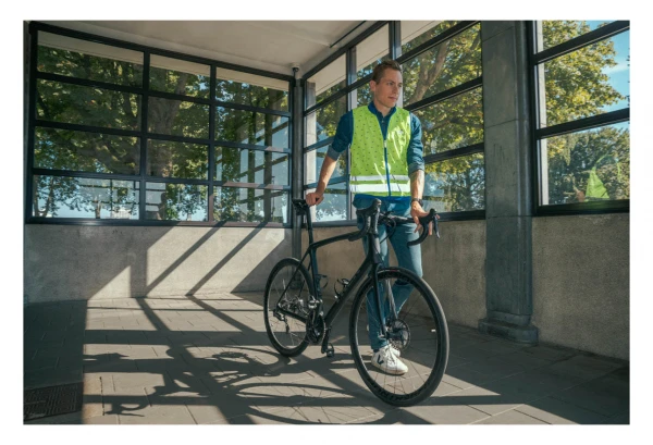- Tissu à côtes contrasté au niveau du col et de l’ourlet + bandes réfléchissantes horizontales (certificat EN1150).