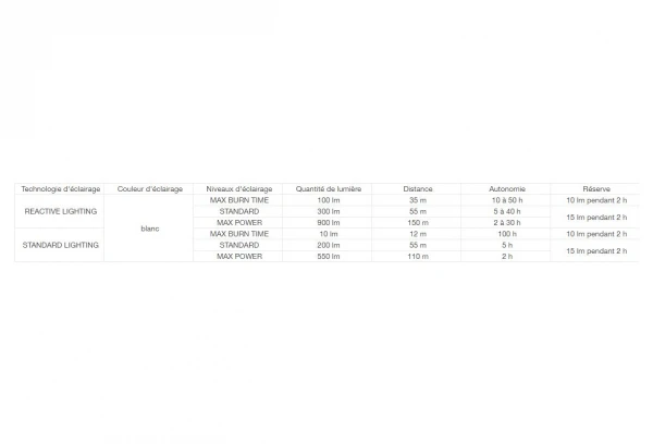- plus d’autonomie, de confort visuel et des manipulations réduites avec le mode REACTIVE LIGHTING : la puissance d’éclairage et la forme du faisceau s’adaptent automatiquement, grâce à un capteur de luminosité permettant d’optimiser l’utilisation de la batterie,