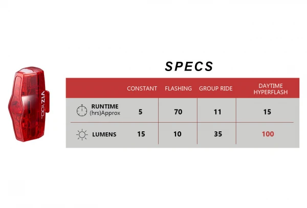Compact et polyvalent, l’éclairage arrière ViZ100 se démarque avec le mode Daytime Hyperflash™ dans un package économique.