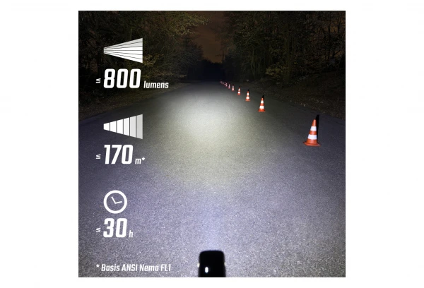 - 5 modes d‘éclairage : High (800 lm) ; Mid (400 lm) ; Low (150 lm) ; Night flashing (600/200 lm) ; Day flashing (200 lm)